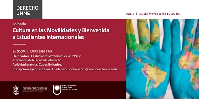 Locales | La Facultad de Derecho y Ciencias Sociales y Políticas de la Universidad Nacional del Nordeste realizará este lunes 22 de marzo a las 15:30, las Jornadas Cultura en las Movilidades para dar la bienvenida a estudiantes extranjeros que cursarán este cuatrimestre en la Facultad de Derecho y también, a quienes llegan a la Universidad Nacional del Nordeste mediante esta modalidad virtual, sin desplazamiento.