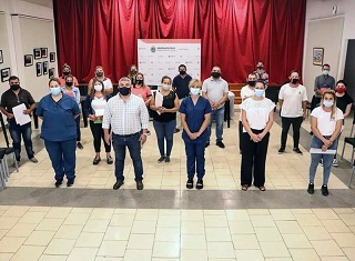 En las instalaciones del Centro Cultural 'La Flota', la secretaria de Gobierno, Paola Latyn, y la coordinadora de Salud del municipio, Damaris Oviedo, acompañaron la realización de una capacitación al personal administrativo y del Hospital Eva Perón, respecto a la inminente llegada de las primeras vacunas contra el Covid-19 a la ciudad portuaria.