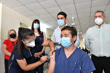 Locales | Personal de salud de los hospitales "Salvador Mazza" y "Enrique V. de Llamas" comenzó a recibir la primera dosis de la Sputnik V. "Es un día importante, ya que iniciamos la vacunación en dos ciudades con circulación viral sostenida y un número alto de casos acumulados a lo largo de la pandemia", resaltó la ministra de Salud Pública, Paola Benítez.