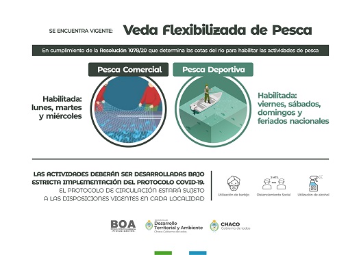 Locales | La Secretaría de Desarrollo Territorial y Ambiente recordó que la actividad se encuentra regulada por la Resolución N°1078/20, que determina las cotas de los ríos para definir el tipo de veda a aplicar. Pescadores comerciales y deportivos pueden pescar hacerlo tres días cada uno, respetando los protocolos establecidos para prevenir contagios del COVID-19.