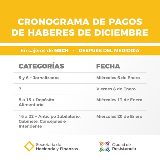 Locales | La Secretaría de Hacienda y Finanzas de la Ciudad informó que los pagos de haberes de diciembre comenzarán este miércoles 6 de enero, después del mediodía, para jornalizados y agentes municipales de Resistencia comprendidos en las categorías 5 y 6.