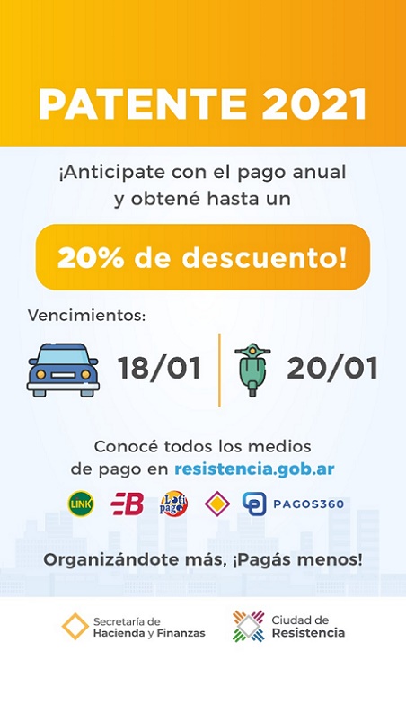 Locales | La Ciudad tiene disponible el beneficio de hasta el 20% de descuento al contribuyente que se anticipe con el pago anual de patente 2021 de automotor y de motocicleta. Hay múltiples alternativas de pago disponibles que el ciudadano puede conocer ingresando en resistencia.gob.ar