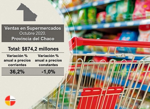 Locales | Los supermercados locales, durante octubre de 2020 tuvieron una nueva caída en términos reales de sus ventas, siendo así el quinto mes consecutivo de descensos. La baja medida a precios constantes fue del 1,0%, teniendo ventas por más de $870 millones. Electrónicos y artículos del hogar junto a frutas y verduras tuvieron importantes alzas, pero rotisería, panadería y carnes cayeron con fuerza, según un informe de la consultora Politikon Chaco, en base a datos del INDEC.