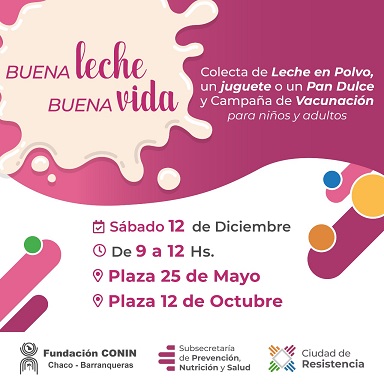Locales | La Cooperadora de la Nutrición Infantil (CONIN) Barranqueras concretará este sábado, de 09 a 12, una nueva jornada de colecta de leche entera en polvo y juguetes en la plaza 25 de Mayo, en la equina de la avenida Alberdi; y en la 12 de Octubre, en el cruce de calle Liniers y Rivadavia. La Ciudad de Resistencia, a través de la Subsecretaría de Salud, acompaña esta iniciativa y se suma junto al Departamento de Inmunizaciones de la Provincia para desarrollar en simultáneo la campaña de vacunación gratuita para que los chicos puedan acercarse a completar su calendario de vacunas.