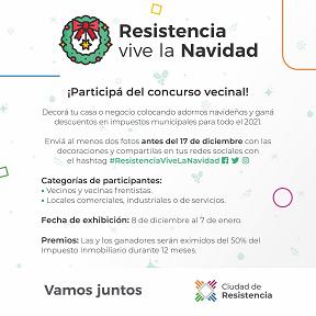 Locales | La Ciudad lanzó el Concurso “Resistencia vive la Navidad”, que tiene por objetivo incentivar el espíritu en esta época del año tan especial, y fue creado a partir de la aprobación de la ordenanza N° 13.414. Quienes quieran participar deberán decorar con motivos navideños el frente de sus casas, locales comerciales, industriales o de servicios, y la ornamentación deberá permanecer desde el 8 de diciembre hasta el 7 de enero del siguiente año.
