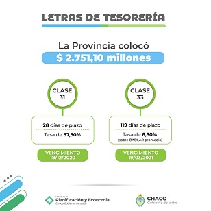 Locales | La Provincia del Chaco, a través del Ministerio de Planificación y Economía, obtuvo este miércoles una colocación récord de letras, por un total de $2.751,10 millones. La cifra es superior a todas las licitaciones anteriores, superando incluso a la del mes de julio, que alcanzó un total de $2.389,58 millones.