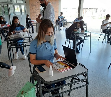 Estudiantes del último año de 16 escuelas secundarias en el interior provincial retomaron las clases presenciales, seguras y voluntarias este lunes. También se sumaron 13 Centros de Educación Física. La ministra Daniela Torrente acompañó a la comunidad de la EES N° 113 de La Escondida.