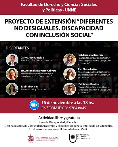 Locales | En el marco de acción propuesto por los integrantes del Proyecto de Extensión "Diferentes. No Desiguales. Discapacidad Con Inclusión Social" de la Facultad de Derecho, Ciencias Sociales y Políticas de la UNNE, se realizará este lunes 16 de noviembre desde las 18 horas, el primer encuentro virtual de intercambio y capacitación entre los protagonistas del proyecto y público en general interesado en la temática.