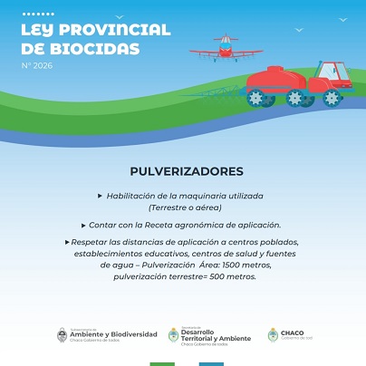 La Secretaría de Desarrollo Territorial y Ambiente de la provincia recuerda a productores y aplicadores que, según la Ley de Biocidas vigente N° 2026, para poder realizar una aplicación de agroquímicos se debe contar con: operario con carnet habilitante, la habilitación de la maquinaria utilizada otorgada por la Subsecretaría de Ambiente y Biodiversidad, y receta agronómica de aplicación (RAA).