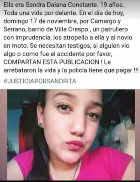 Nacionales | La víctima iba en moto con su novio y los familiares buscan testigos del accidente. Denuncian que el móvil policial cruzó con el semáforo en Rojo.