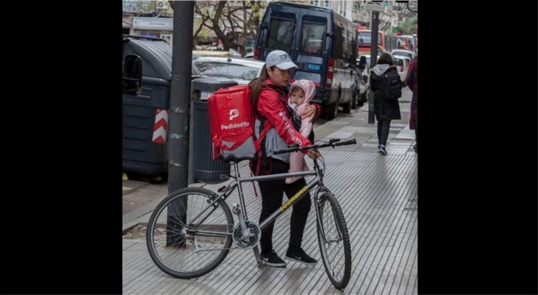 Nacionales | La foto de una mujer con el uniforme de PedidosYa cargando a un bebé se hizo viral en las redes sociales. Muchos de los usuarios y políticos que compartieron la imagen aseguraron que reflejaba la precarización laboral, considerando que tenía que llevar a su hija al trabajo.