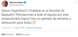 Nacionales | Mauricio Macri felicitó a la selección de básquet a través de un enfático tuit donde resaltó el valor del trabajo en equipo por el logro. "Son un ejemplo de esfuerzo y dedicación para todos", dijo el mandatario en la red social.