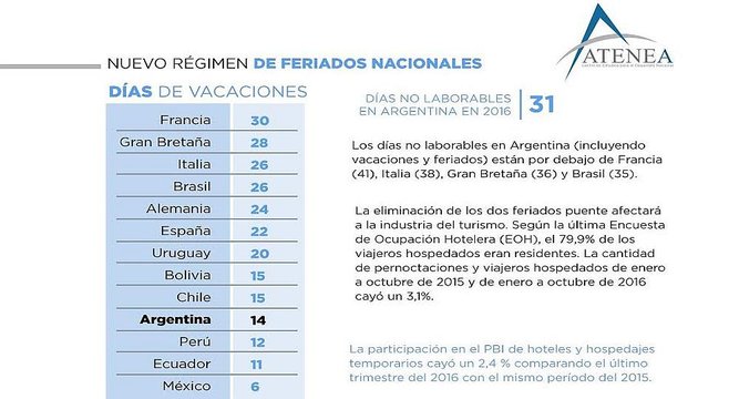 Nacionales | El Centro de Estudios para el Desarrollo Nacional "Atenea" elaboró un informe donde evidencia que la eliminación de los feriados "puente", sumado al actual sistema de licencias "directas", posiciona a nuestro país como uno de los países con menor cantidad de días de descanso.