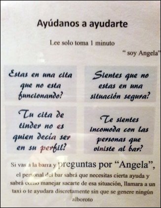 Nacionales | Sos mujer, estás en una cita con un hombre que te genera miedo, vas al baño del boliche a pensar qué hacer y te encontrás con un cartel que te ofrece ayuda si vas a la barra y preguntás por 'Angela', así es la iniciativa de un bar de la provincia norteña de Salta, que así se suma a una campaña mundial de protección ante la violencia que surgió en Gran Bretaña.