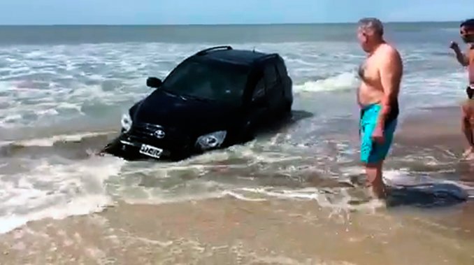 Nacionales | Una camioneta se quedó completamente estancada en la playa mientras subía la marea y sus ocupantes no querían bajar, a pesar del intento de ayudarlos a salir de un par de policías.