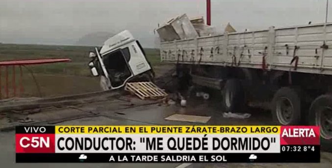 Nacionales | El conductor del camión que chocó este miércoles con varios vehículos y quedó colgado sobre el guardarraíl del Complejo Ferrovial Zárate - Brazo Largo, en sentido a Capital Federal, reconoció que se quedó dormido.