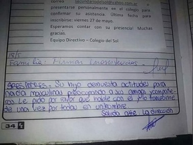 Nacionales | Los directores del secundario Del Sol de Burzaco habrían escrito una nota discriminadora en la libreta de comunicaciones de un alumno, en la que le piden a sus padres que lo "transformen en un hombre" porque "demuestra actitudes para nada masculinas".