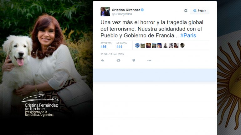 La Presidente se refirió en Twitter a los atentados en la capital francesa y expresó su solidaridad. "Urge abordar la cuestión desde una perspectiva más amplia", señaló.