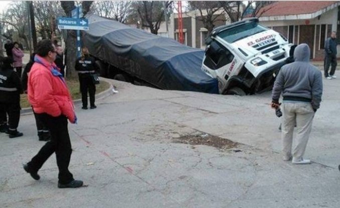 Nacionales | A raíz del peso del transporte, que iba cargado con materiales para la construcción, el pavimento cedió sin darle tiempo al chofer de realizar alguna maniobra para evitar caer en el pozo.