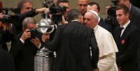 Nacionales | El papa recibió hoy en el Vaticano a una delegación de San Lorenzo, encabezada por el presidente Matías Lammens y el vicepresidente Marcelo Tinelli, quienes le entregaron la Copa que acaba de obtener la entidad de Boedo y una camiseta con su nombre.