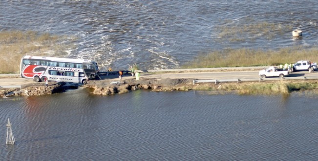 Nacionales | La ruta 188 se había "quebrado" como consecuencia de la crecida del Río V y estaba cortada. El micro de la empresa Chevallier llevaba 26 pasajeros, desde Buenos Aires a Mendoza.