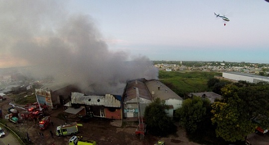 Locales | Hace más de tres horas intentan controlar el voraz incendio en 25 de Mayo al 2550 en un depósito de Megamundo. El helicóptero lleva agua desde el Río Negro.
