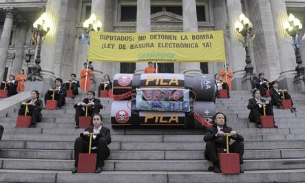 Nacionales | Integrantes de la organización ambientalista Greenpeace realizaban esta mañana una particular protesta frente al Congreso de la Nación para exigir la urgente sanción de la Ley de Residuos Electrónicos.