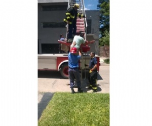 El arnés de seguridad sufrió una falla y el operario quedó pendiendo peligrosamente de una soga. Los bomberos lo rescataron y ayudaron a descender a través de una escalera mecánica.