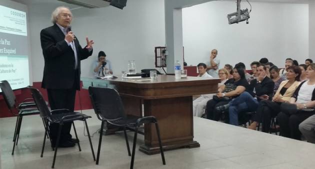Locales | El Premio Nobel de la Paz habló ante un colmado salón de la Facultad de Medicina. La rectora de la Universidad Nacional del Nordeste, DelfinaVeiravé lo distinguió con el título “profesor honorario”.