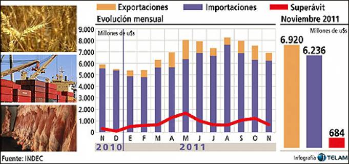 Nacionales | El intercambio comercial alcanzó en noviembre un superávit de 684 millones de dólares, el doble de lo obtenido en igual mes del año pasado, informó el Instituto Nacional de Estadística y Censos (INDEC).