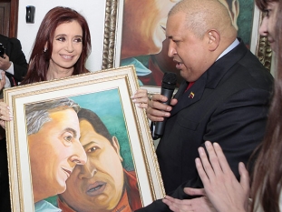 Nacionales | El caudillo caribeño realizó una obra donde se lo ve junto a Néstor Kirchner y se la regaló a la mandataria argentina, que se mostró muy conmovida. La jefe de Estado reveló que el día que se enteró de la enfermedad que padece su par venezolano lloró junto a su hija.
