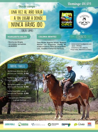 El próximo 6 de septiembre el grupo de turismo asociativo “Ecoturismo Chaco-Experiencia Natural”, presentará el paquete “Día de Campo” que consiste en un recorrido natural por Colonia Benítez y Margarita Belén.