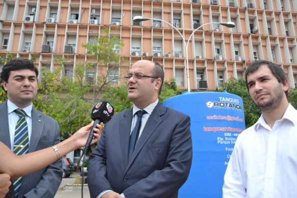 El ministro de Gobierno , Javier Oteo acompañado por el gerente zonal del Banco Nación, Eduardo Mena y el representante de Asuntos Municipales de la Nación, Bernardo Bolo formalizaron este viernes la entrega de tanques de almacenamiento de agua con capacidad de 26.000 litros para parajes y zonas rurales de siete localidades chaqueñas.