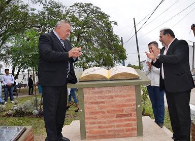 Locales | El intendente Antonio Rodas junto a representantes de las iglesias católicas y evangélicas de la ciudad de Fontana, descubrió un monolito en conmemoración a la santa Biblia. El acto se llevó a cabo en la plaza central de la localidad. La inauguración del monumento fue acompañado por vecinos, autoridades provinciales, locales y las fuerzas de seguridad.