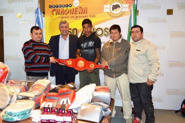 Locales | El vocal oficial de Lotería Chaqueña, Rubén González, hizo entrega de equipamiento deportivo a miembros de la Sub Comisión de Boxeo del Club Atlético Marcelino Ugarte de Coronel Du Graty, que el sábado último consagró a dos nuevos campeones provincia