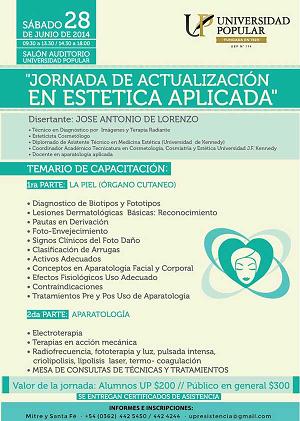 El próximo 28 de junio a partir de las 09.30 horas , la Universidad Popular de Resistencia, realizará una "Jornada de Actualización en Estética Aplicada" , dirigida a cosmetólogas, esteticistas, profesionales de belleza, y al público en general; una excelente oportunidad para incorporar los últimos conocimientos en estética, adquirir técnicas actuales y presenciar importantes demostraciones.