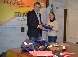 Locales | El presidente de Lotería Chaqueña, Néstor Rolhaiser, hizo entrega de equipamiento deportivo a la nadadora juvenil con discapacidad intelectual, Erica Lovera Morales, quien la semana próxima participará de un torneo internacional en el Centro Nacional de Alto Rendimiento Deportivo (CENARD).