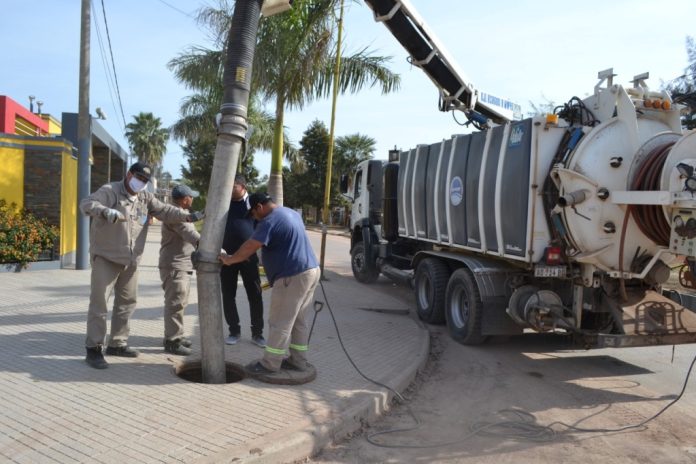 Los trabajos ejecutados por operarios de la empresa provincial consistieron en la limpieza de cañerías, redes domiciliarias y bocas de registro en la zona céntrica de la localidad.