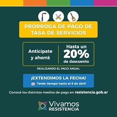 Resistencia informa que este viernes finaliza la prórroga para sumarse a los beneficios que contempla el pago anual anticipado de Tasa de Servicios. Quienes abonen durante la jornada pueden acceder a un descuento del 10% por el pago anticipado del período 2022 y otro 10% para aquel contribuyente que también cumplió con este tributo en 2021.