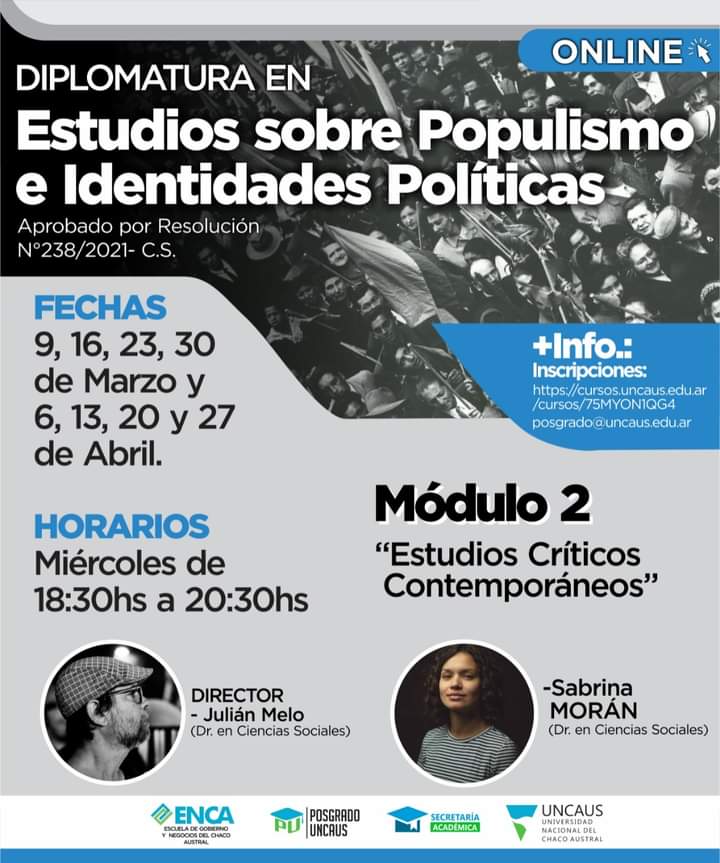 Locales | La Universidad Nacional del Chaco Austral (UNCAus) invita a participar del Módulo N° 2titulado “Estudios Críticos Contemporáneos”, que se realizará de manera on line en los días 09, 16, 23 y 30 de marzo y 06, 13, 20 y 27 de abril del corriente año. Las clases se realizarán en el marco de la Diplomatura en Estudios sobre Populismo e Identidades Políticas.