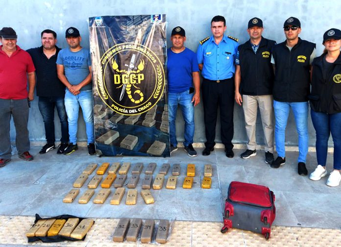 Locales | En horas de la siesta de este viernes, el personal dependiente de la Dirección General de Consumos Problemáticos logró incautar 35 panes de Marihuana que se encontraban dentro de una valija que personas desconocidas la dejaron dentro de un contenedor de basura en una maniobra encubierta para concretar una venta.
