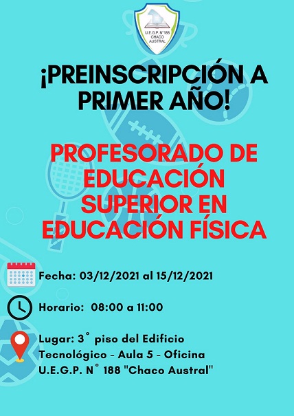 Locales | Las preinscripciones se realizan a través de la U.E.G.P. N° 188 “Chaco Austral”, hasta el día 15 de diciembre de 2021, en el horario de 8 horas a 11 horas de lunes a viernes.