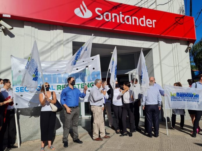 Locales | En el marco de una medida de fuerza nacional, trabajadores nucleados en la Asociación Bancaria de Resistencia se movilizaron a las filiales del Banco Santander-Río contra el cierre de 100 sucursales de esa entidad en todo el país y el no pago del bono anual. En la provincia hay dos sucursales del banco.