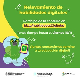 Locales | Desde ayer y hasta el lunes 15 de noviembre, está disponible el formulario online disponible en el siguiente enlace: https://bit.ly/habilidadesDigitales. El objetivo es diseñar políticas públicas que permitan fortalecer la educación digital.