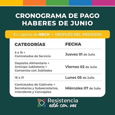 Locales | Resistencia informa que a partir de este jueves 1 de julio iniciará el pago de haberes correspondiente al mes de junio para sus empleados municipales. Los cuáles serán depositados en las cuentas del Nuevo Banco del Chaco (NBCH).